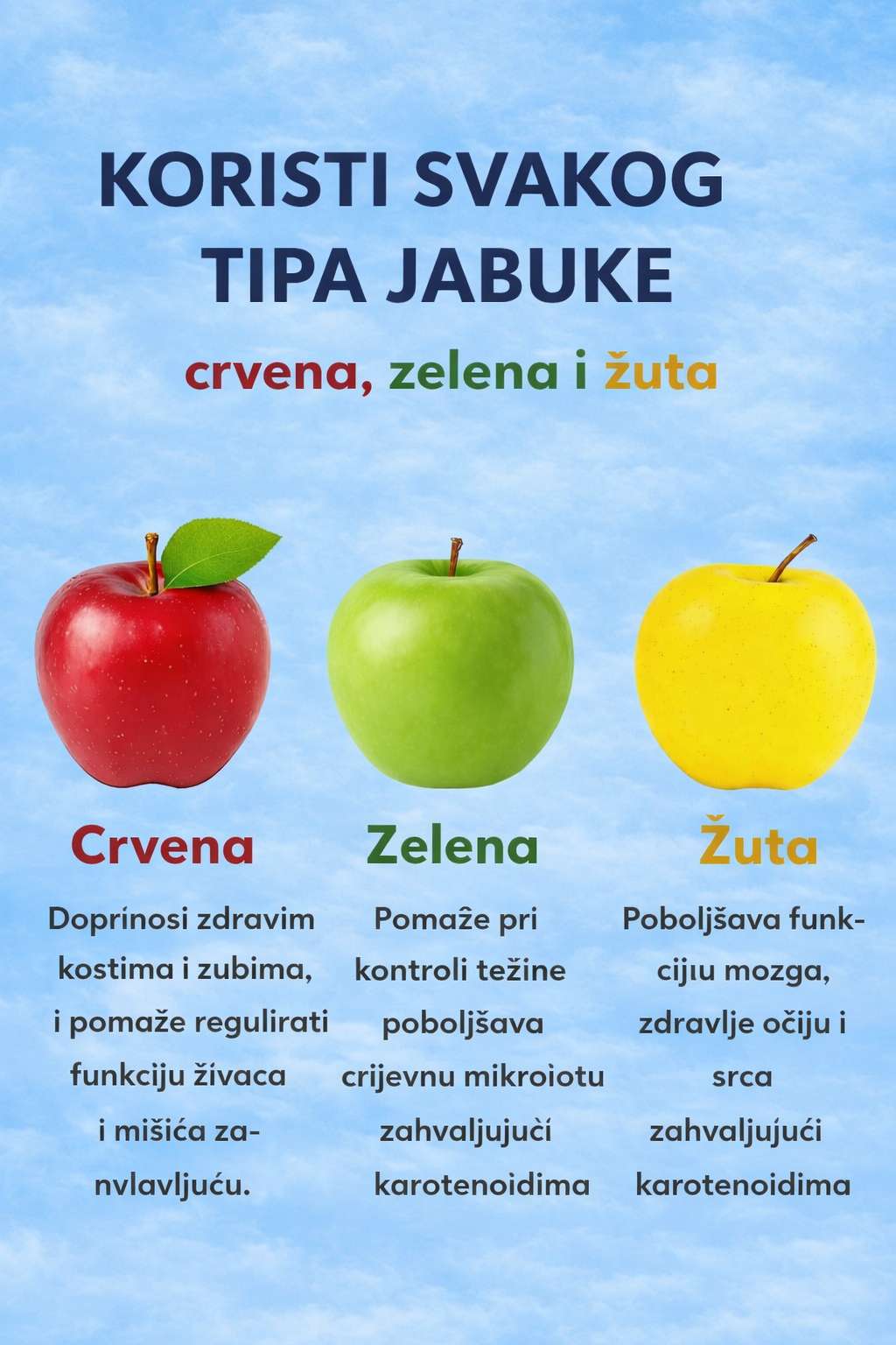 Jabuka se s razlogom smatra jednim od najzdravijih plodova na planeti. Kombinacija soka od različitih vrsta jabuka, posebno kada se pomiješa s mrkvom ili cveklom, može imati snažno ljekovito djelovanje. Infografika na slici lijepo prikazuje kako crvena, zelena i žuta jabuka doprinose obnovi organizma.