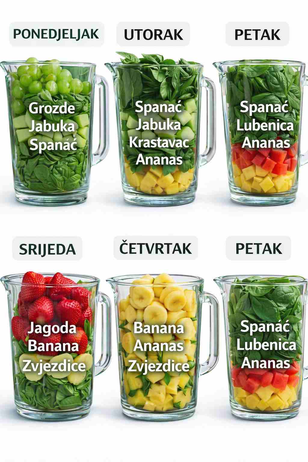 Slobodno ponovite svoje omiljene namirnice iz sedmice ili kombinirajte elemente. Ključ je dosljednost – ciljajte na jedan smoothie bogat hranjivim tvarima dnevno. Evo kratkog pregleda u obliku tačaka radi lakšeg snalaženja: