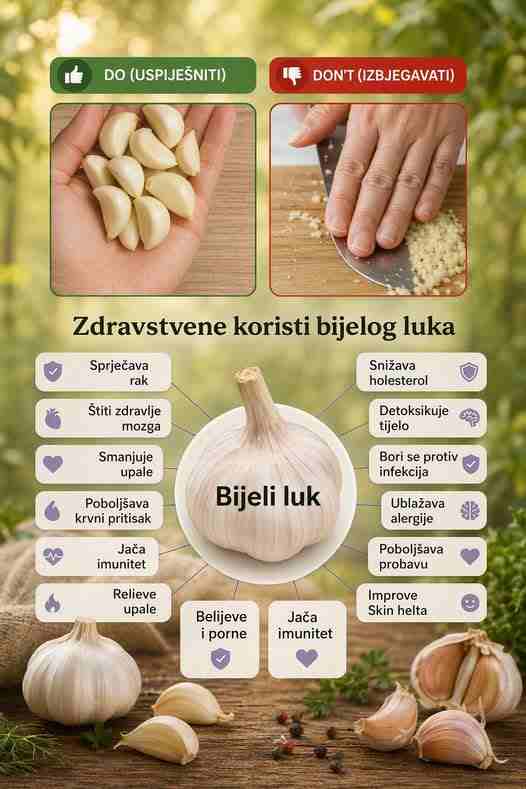 Bijeli luk je više od običnog začina – to je prirodna ljekovita kutija u jednoj glavici. Od poboljšanja pamćenja i zaštite mozga do snižavanja holesterola i borbe protiv infekcija, njegove koristi su širokog spektra i duboko utjecajne. Dodavanje bijelog luka u vašu dnevnu rutinu, bilo sirovog, kuhanog ili u čaju, može biti jednostavan, ali moćan način za poboljšanje vašeg cjelokupnog zdravlja.
