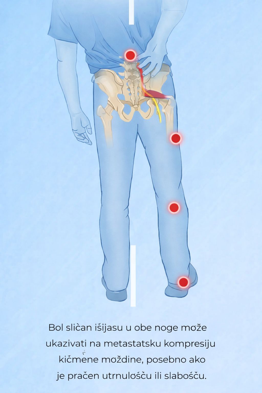 Ako se bol širi u obe noge istovremeno, naročito ako je praćen utrnulošću ili slabošću, to može ukazivati na kompresiju kičmene moždine, uključujući i metastatsku kompresiju. U takvim slučajevima neophodno je hitno obratiti se lekaru.