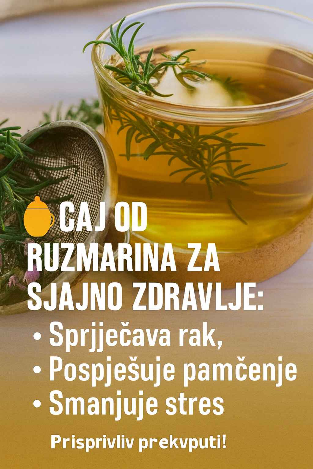 Ovaj napitak može ublažiti migrene, glavobolje i zatvor, uzrokovane prehladom i gripom. Započnite dan čajem od ruzmarina koji ima odlična revitalizirajuća svojstva. Umiruje um i telo, a vas će održati svežim i odmornim.