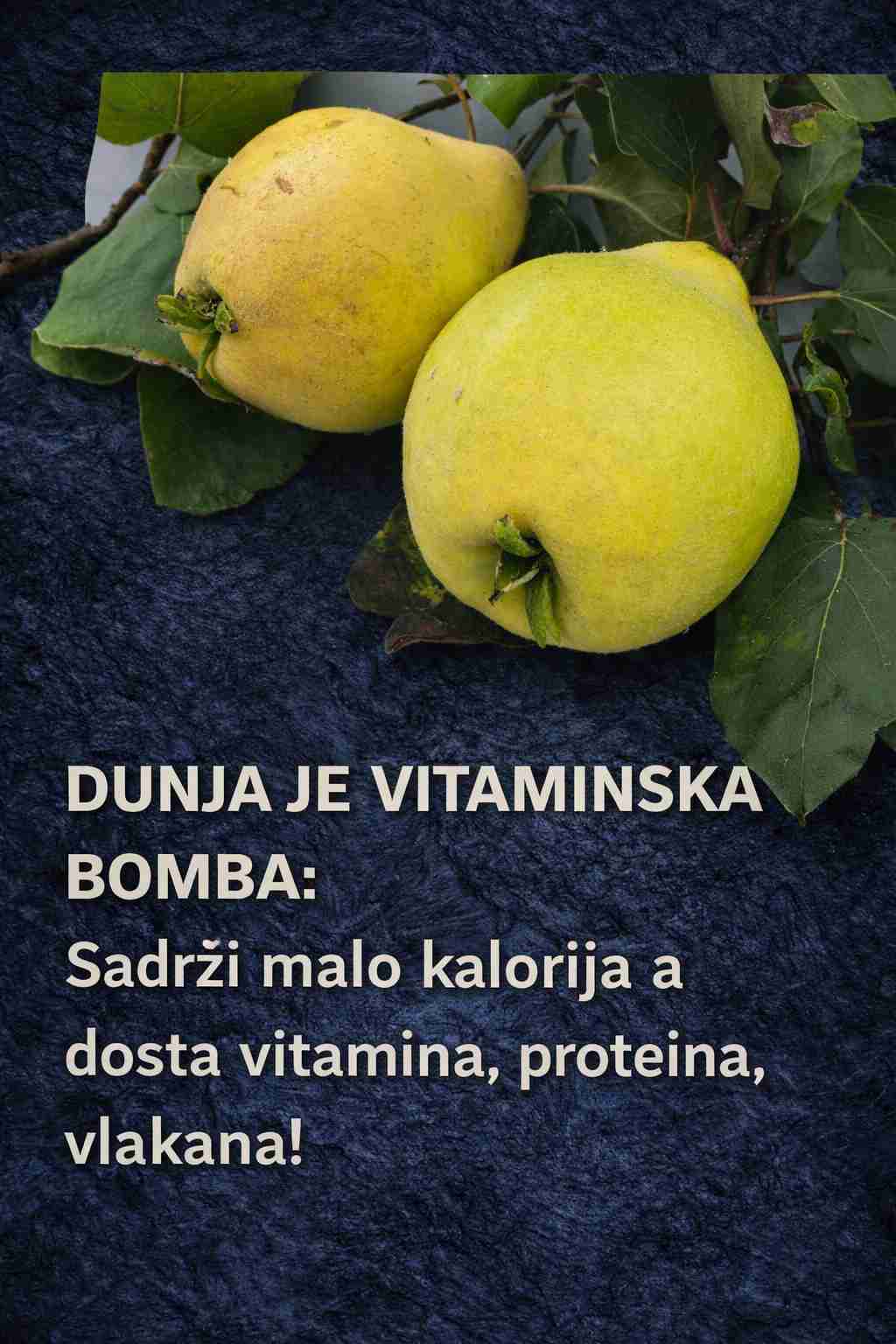 Ono što dunju čini posebnom jeste to što sadrži vrlo malo kalorija, a istovremeno je bogata vitaminima, vlaknima i drugim važnim nutrijentima. Posebno je bogata vitaminom C, koji pomaže jačanju imuniteta i štiti organizam od prehlada i infekcija. Pored toga, dunja sadrži i antioksidanse koji pomažu u borbi protiv slobodnih radikala i doprinose očuvanju zdravlja.
