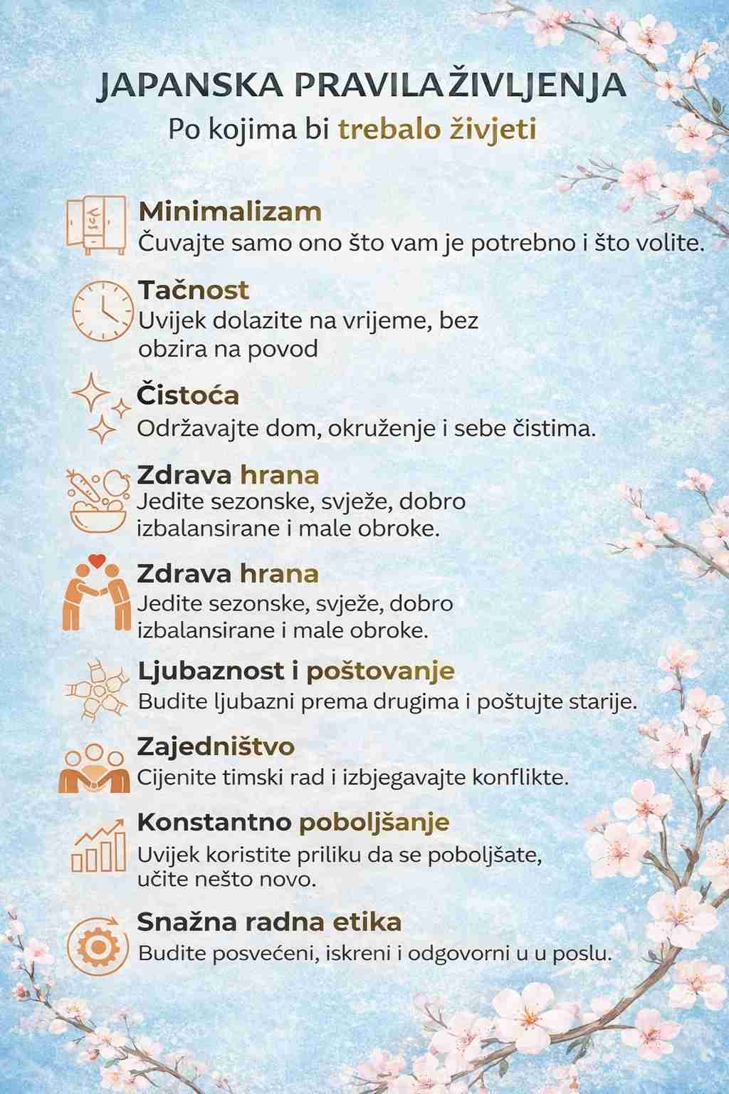 Japan je odavno poznat po svojoj dugovječnosti, disciplini i kvaliteti života. Njihova kultura obiluje praktičnim i jednostavnim pravilima koja pomažu ljudima da žive smirenije, organizovanije i sretnije. Slika prikazuje osam ključnih japanskih principa koji mogu svakome donijeti više ravnoteže u svakodnevnom životu.