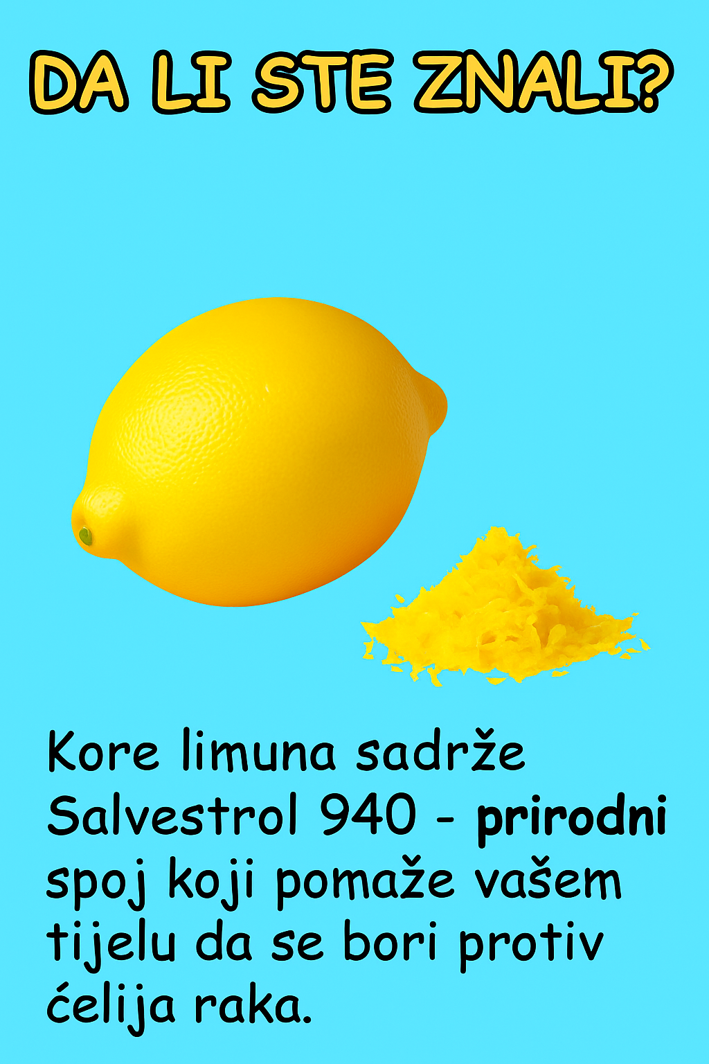 Dakle, sledeći put kada posegnete za limunom, nemojte bacati koru. Ona je prava mala riznica zdravlja – čisti tijelo, štiti ćelije i pomaže vam da iz prirode izvučete maksimum. 🌿🍋