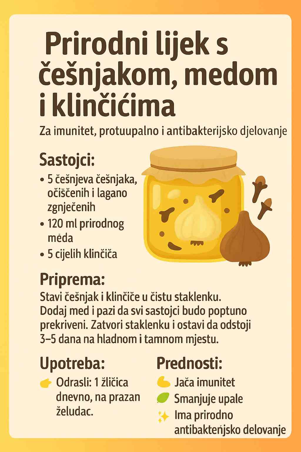 • Češnjak i med koriste se zajedno kao prirodan lijek zbog svojih antibakterijskih i protuupalni svojstava.