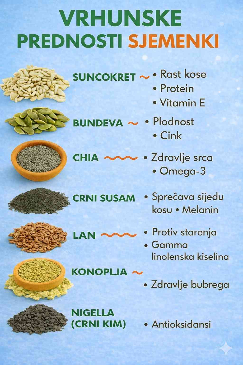 Svaka od ovih sjemenki nosi specifičan profil nutrijenata koji ciljaju različite aspekte zdravlja. Evo detaljnog opisa: