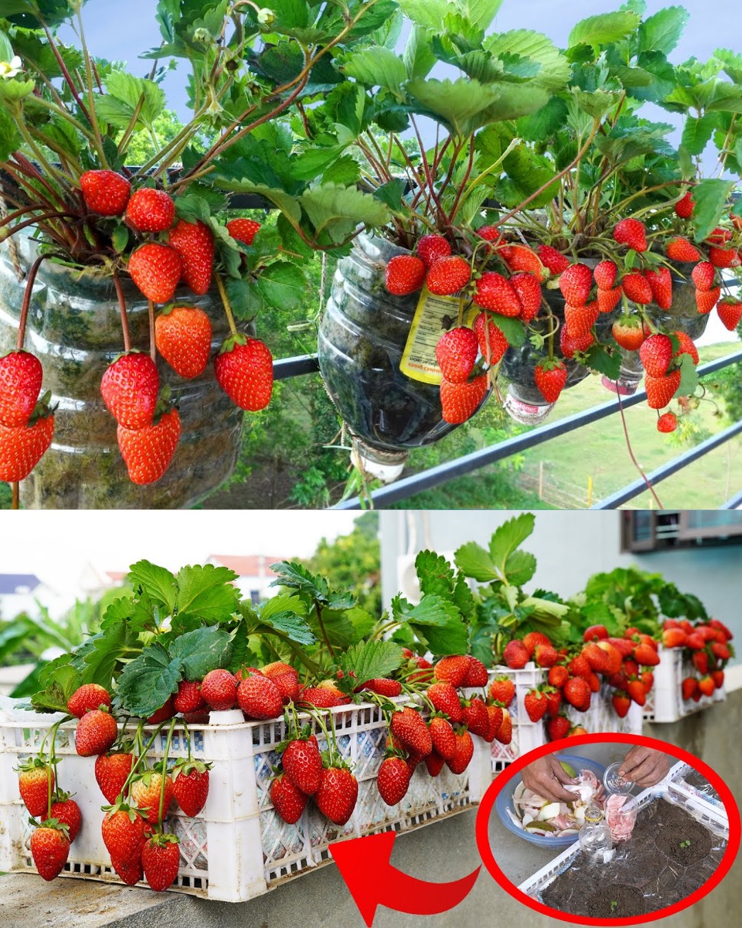Režite ih horizontalno, ostavljajući dno netaknutim kao rezervoar za vodu. Izbušite rupe na kraju poklopca za drenažu. Ova reciklirana verzija ne samo da smanjuje otpad, već i pruža idealno okruženje za bujanje jagoda.