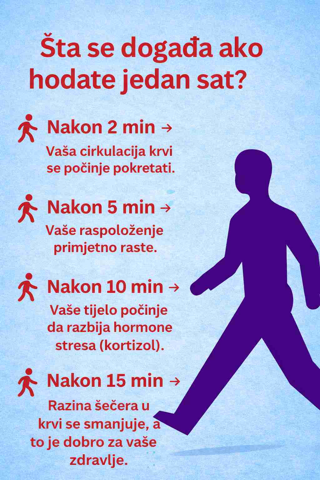 Redovna šetnja od samo jednog sata dnevno donosi brojne koristi za tijelo i um. Iako djeluje jednostavno, svaki minut tokom šetnje aktivira različite procese u našem organizmu koji poboljšavaju zdravlje, raspoloženje i kvalitet života. Evo šta se dešava korak po korak: