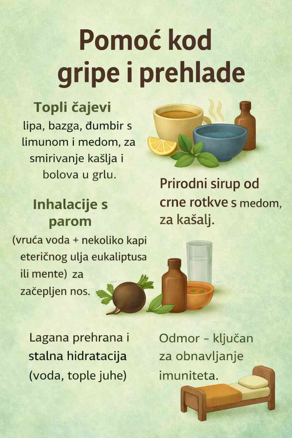 Sezonska gripa i obične prehlade mogu oslabiti tijelo, uzrokujući simptome poput kašlja, upale grla, začepljenosti i umora. Umjesto oslanjanja samo na lijekove, prirodni lijekovi mogu igrati snažnu ulogu u oporavku. Slika ističe jednostavne, učinkovite i prirodne načine podrške vašem tijelu tokom bolesti.