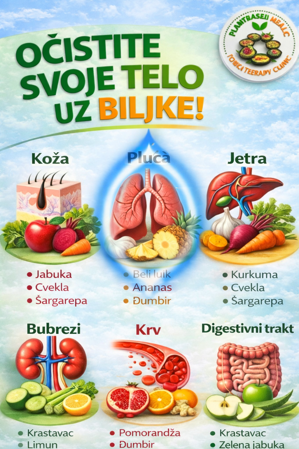 U današnjem brzom svijetu, naša tijela su stalno izložena toksinima iz prerađene hrane, zagađenja i stresa. Jedan od najboljih načina za vraćanje ravnoteže i poboljšanje cjelokupnog zdravlja je uključivanje prirodne hrane biljnog porijekla u vašu dnevnu rutinu. Slika ističe kako određeno voće i povrće mogu podržati različite organe u tijelu, pomažući vam da se detoksicirate i ostanete zdravi na prirodan način.