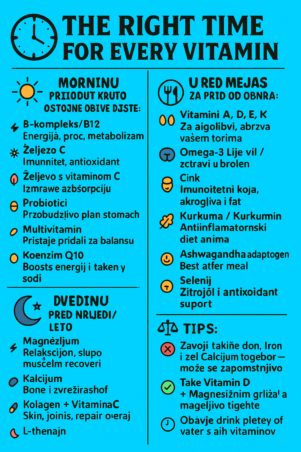 1. Multivitamini Multivitaminski suplementi sadrže mješavinu različitih vitamina i minerala koji mogu pomoći u nadoknadi bilo kakvih nutritivnih nedostataka i sprječavanju nedostatka vitamina. Najbolje vrijeme za uzimanje: Uz obrok za bolju apsorpciju vitamina topivih u mastima. Možete ih uzimati uz svoj najveći obrok u danu poput doručka ili ručka.